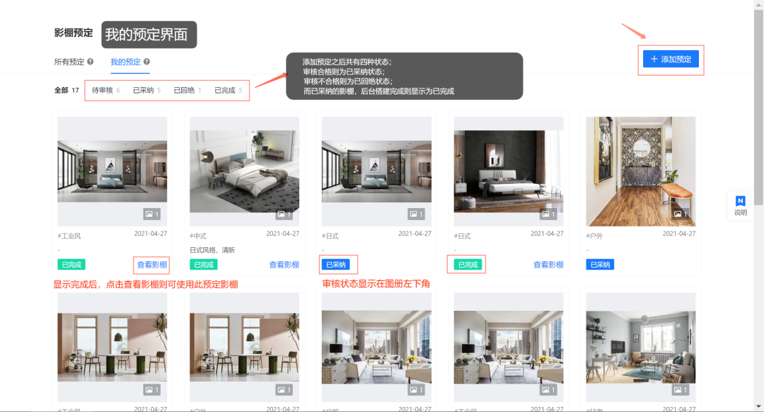 通过审核的预定将会在【所有预定】展示,同时用户可对其他用户发起的预定表示【附议】,附议值越高越有机会提前看到该影棚;