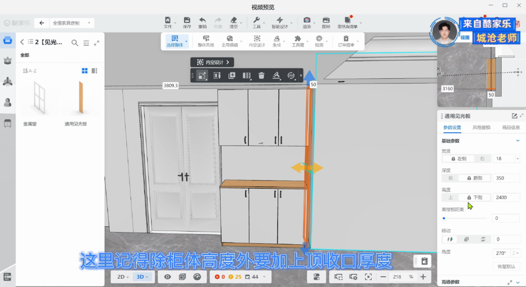 Step3 放置见光板:在[产品库]-[辅料]中找一款通用见光板,放置在柜体右侧,见光板到顶。