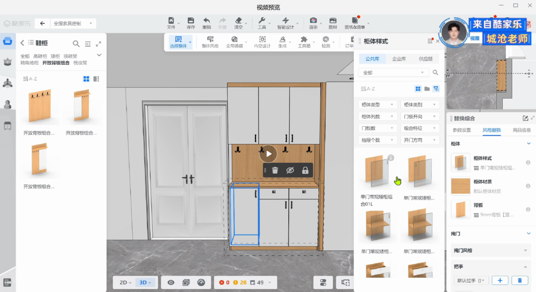 Step7 填充内空组件:接着点击[风格替换]-[柜体样式]选择合适的内空组件,这里可以做成储物罐或鞋柜都可以。