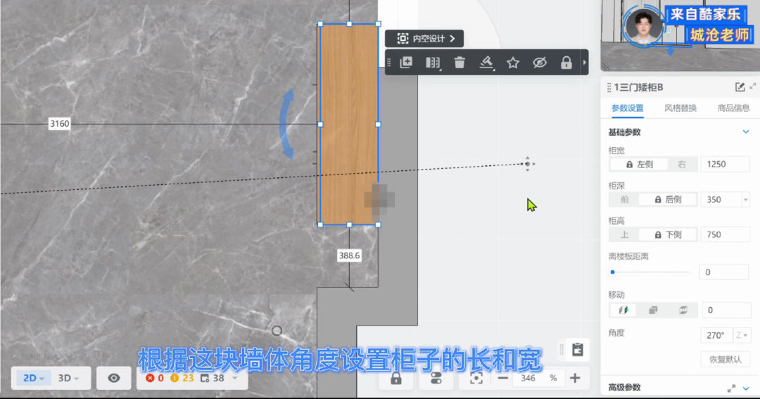Step2:摆放柜体:先找到一款三门下柜,根据墙体角度设置柜子的长和宽。柜高可以设置950,便于一进门不用弯腰放下手中的物品。