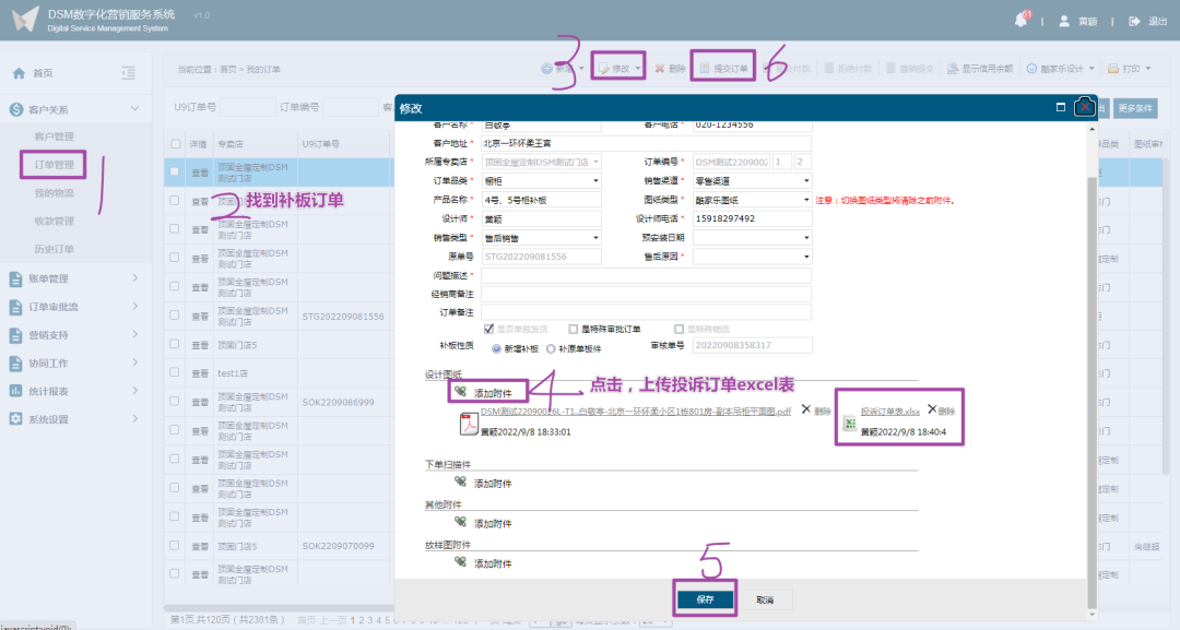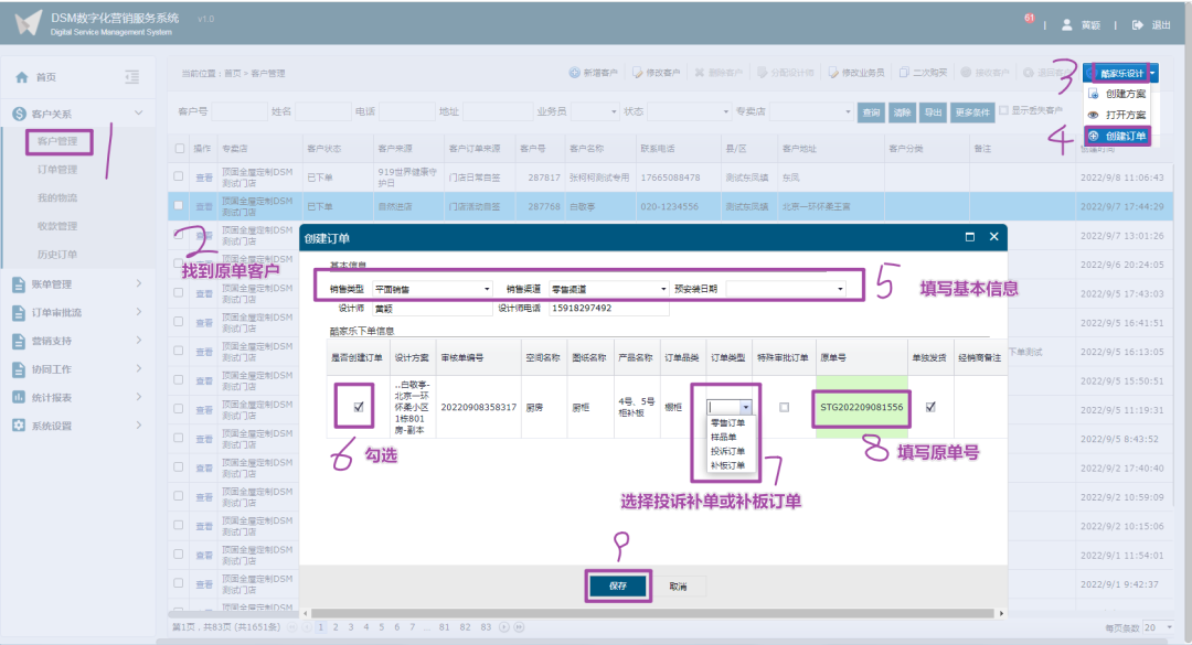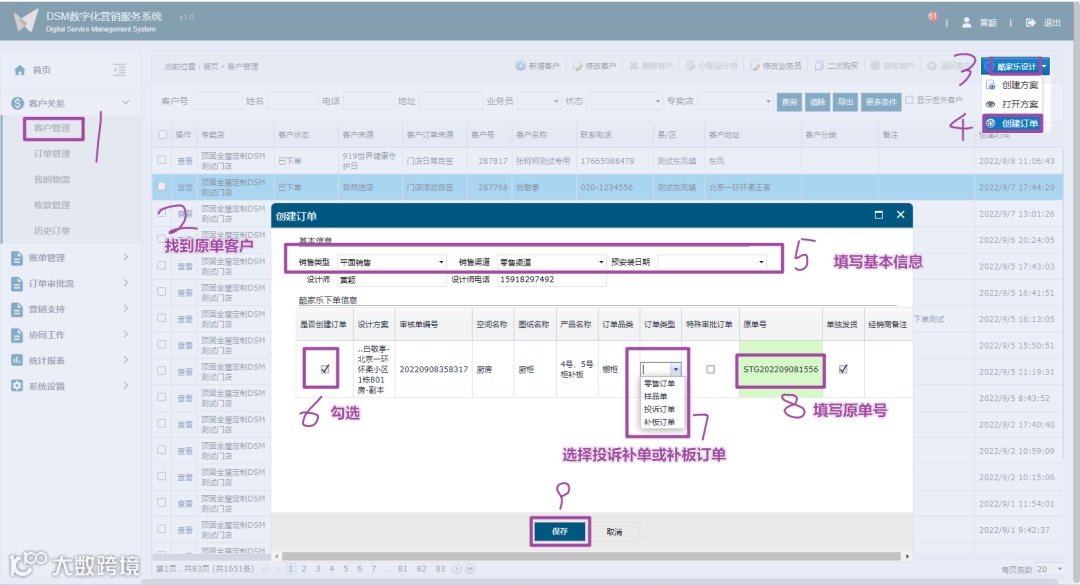 返回DSM系统进入客户管理,找到原单客户创建订单,订单类型选“投诉补板”或“补板订单”,并填写原单号。
