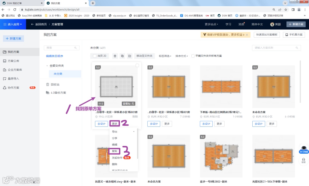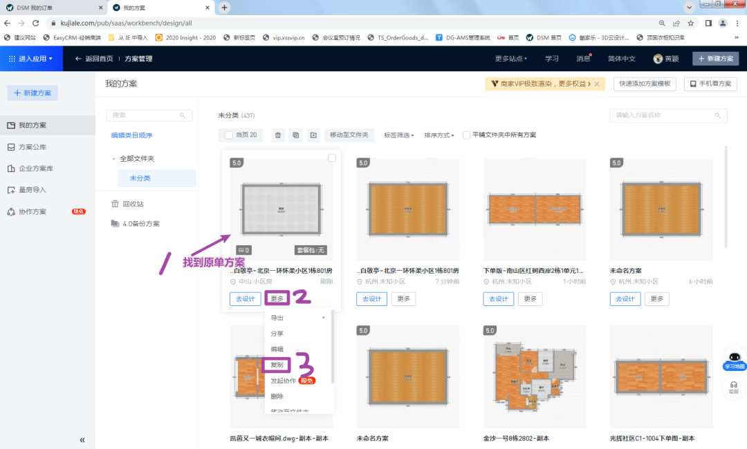 注意:必须通过DSM系统打开酷家乐方案,否则DSM系统创建订单无方案勾选或提交订单是弹出未绑定方案报错提示。