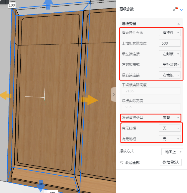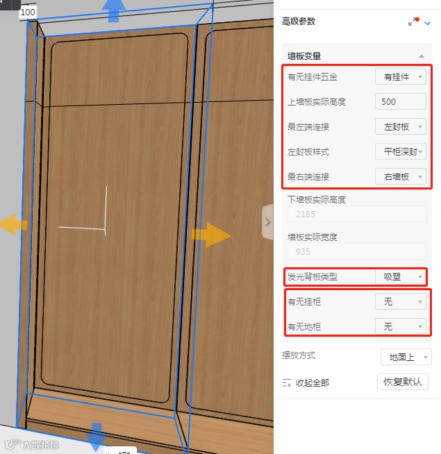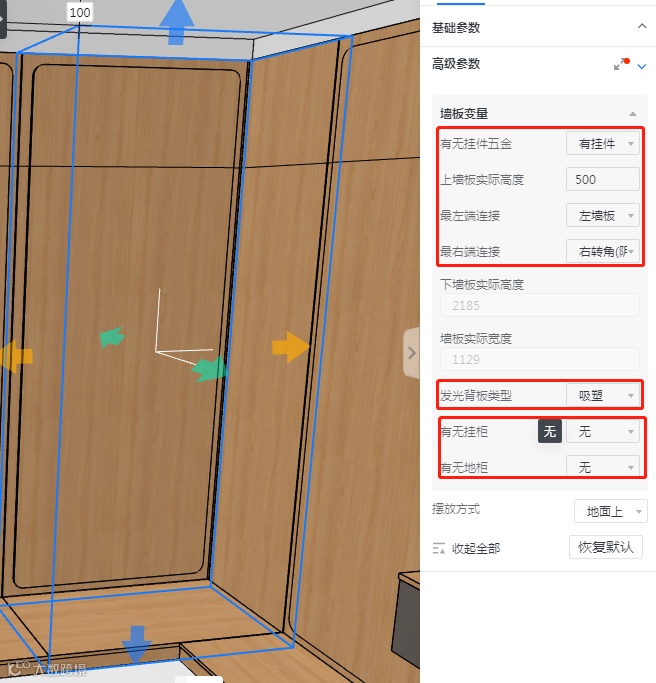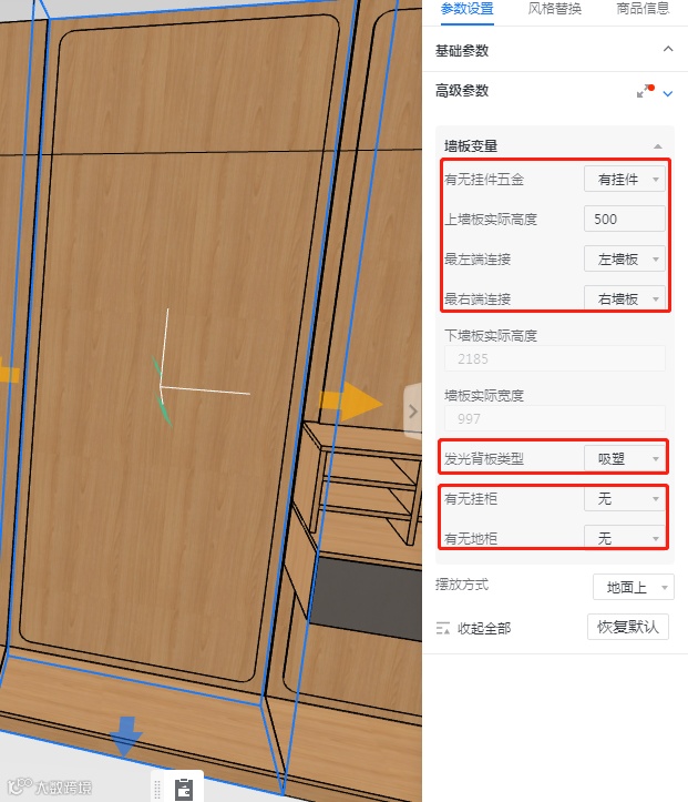 模型自定义发光背板类型默认为不吸塑,如发光背板类型需为吸塑背板,则需在参数设置—高级参数—墙板变量—发光背板类型设置(发光背板类型决定发光背板可选花色)。