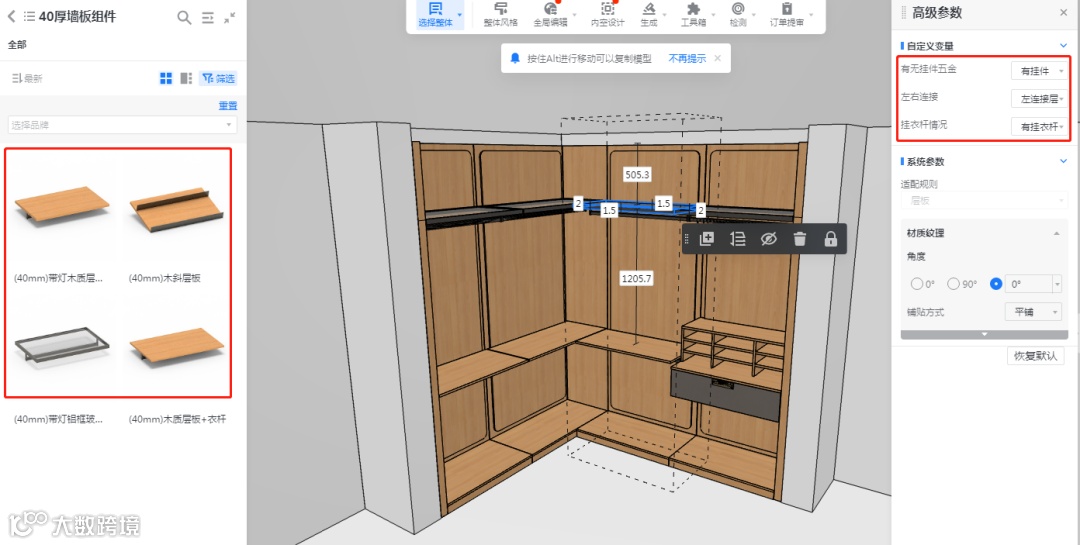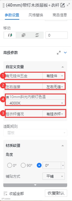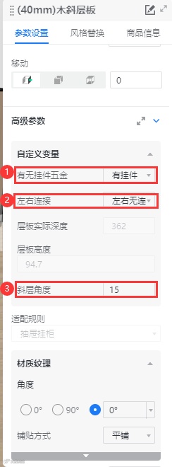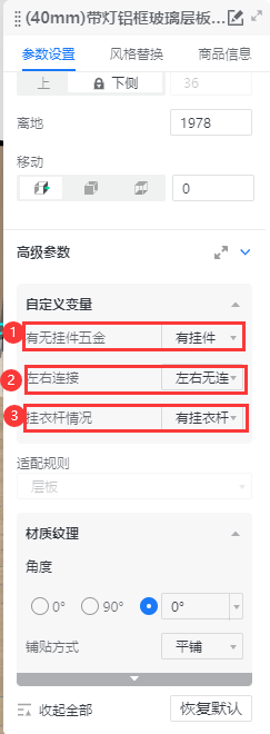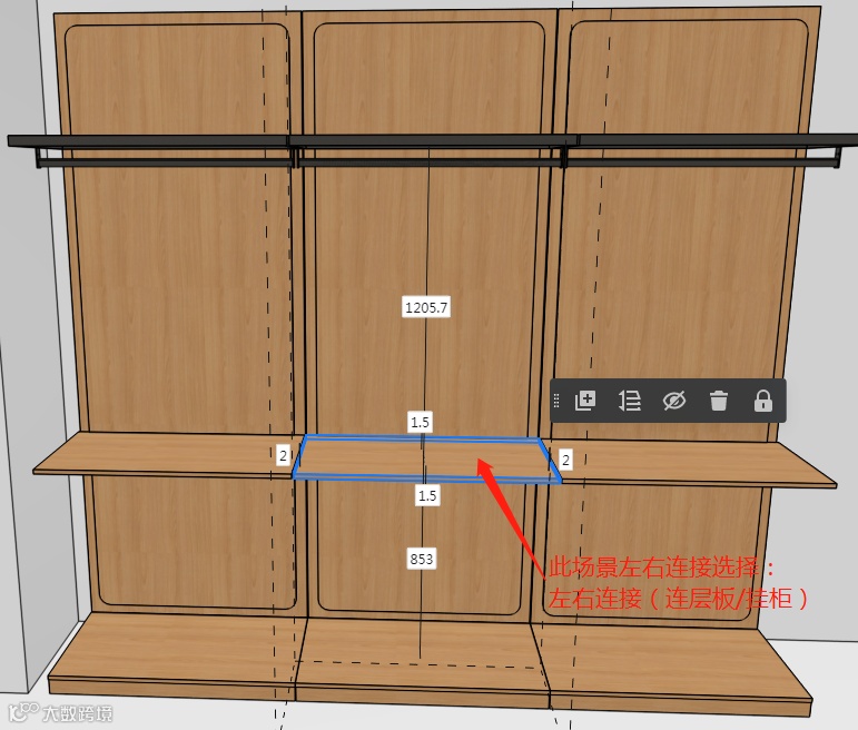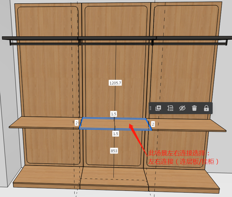 当两块层板平齐时,按场景判断左右连接,选项为:左右连接(连层板/挂柜)、右连接层板/挂柜、左连接层板/挂柜;