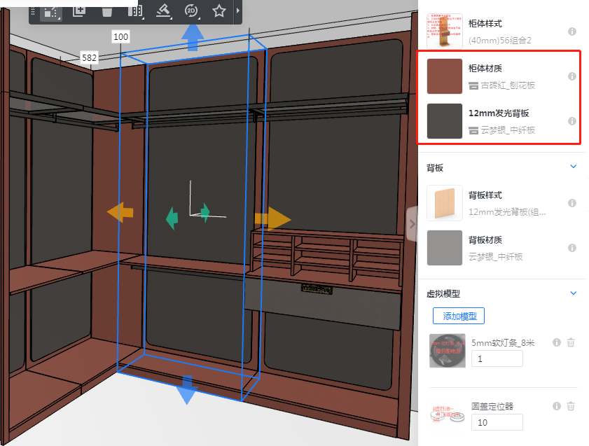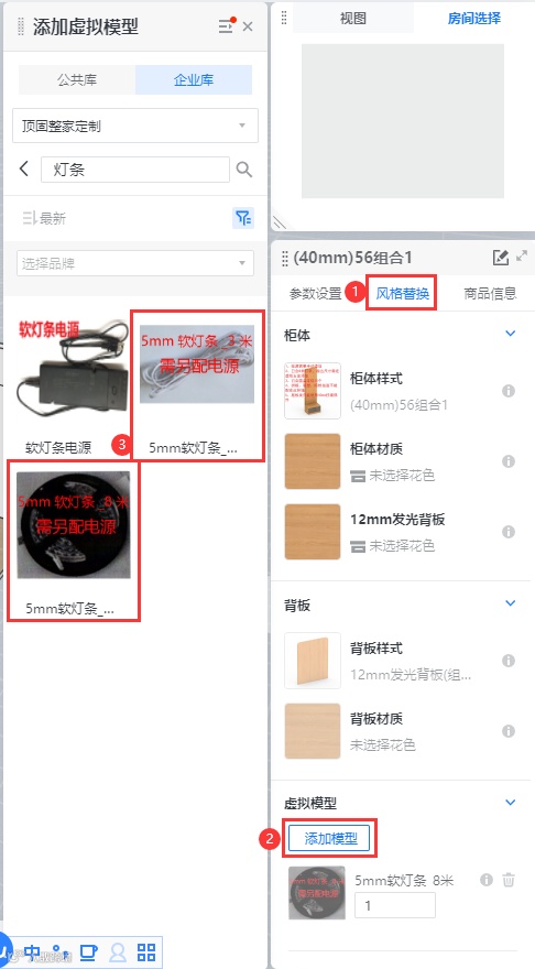 2.40厚56挂墙已包含8米5mm灯条,超出尺寸的灯条需要在虚拟五金里添加对应规格灯条。如图: