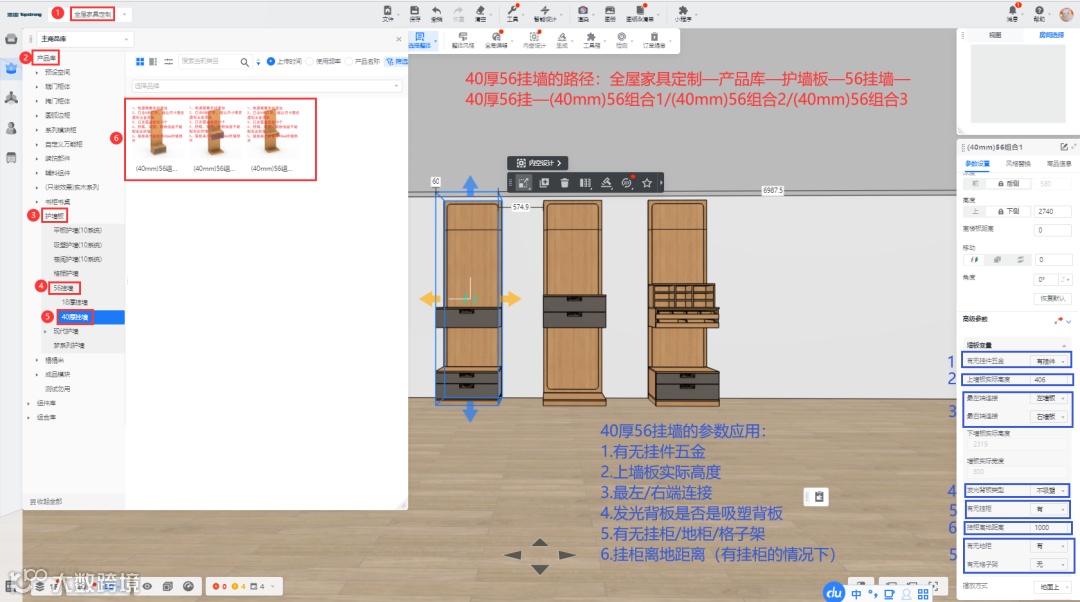 在产品库—护墙板—56挂墙—40厚挂墙,并按需设置好相关基础参数;如图: