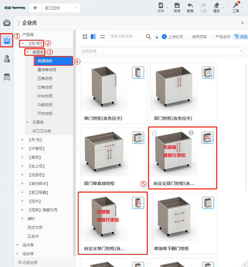 厨卫定制—企业库—产品库-地柜-有背板-普通地柜-自定义双面地柜(含免拉)/自定义单门面地柜(含免拉)