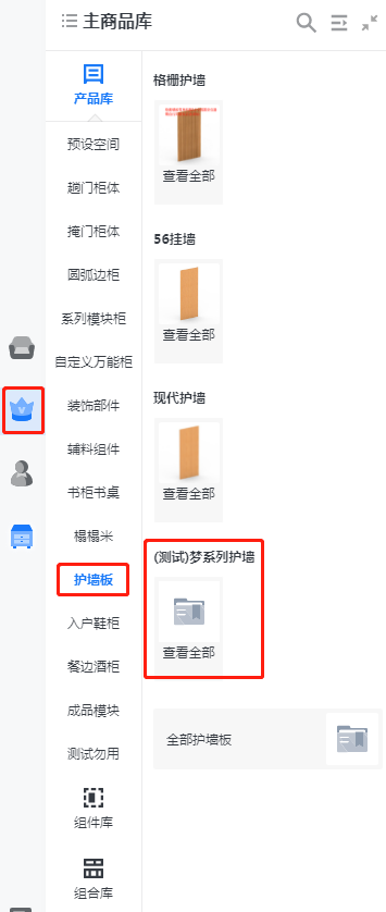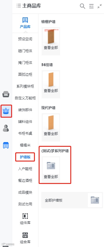 路径:全屋家具定制-企业库-产品库-护墙板,如图:
