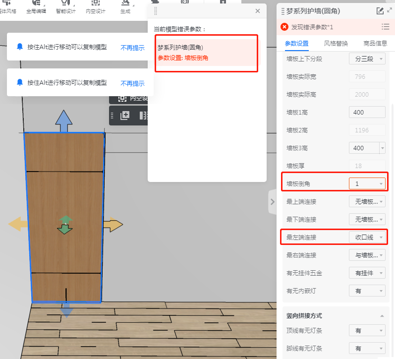 最左/右端连接为收口线时,墙板倒角必须选左/右边倒角,否者会出现报错,如图: