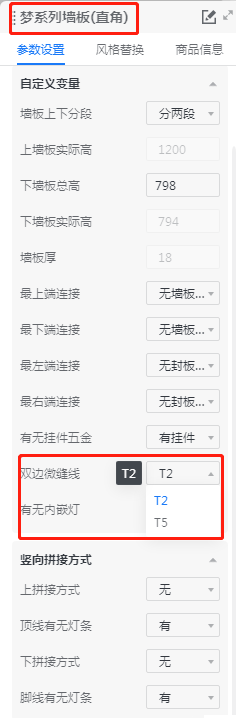 梦系列护墙(阴阳直角)、梦系列护墙(直角)比梦系列护墙(阴阳圆角)、梦系列护墙(圆角)多一个双边微缝线T2/T5,这个按实际设计需求选择,如图: