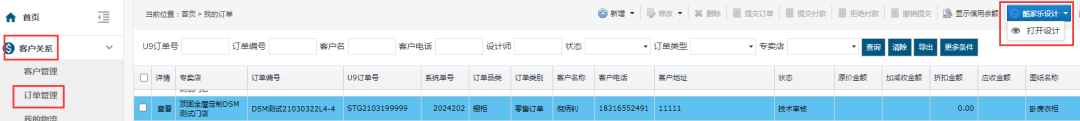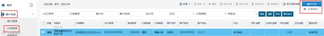 登录DSM,在[订单管理]页面选择被退回的订单,在右上角点击[酷家乐设计]按钮,在下拉框点击[打开设计];
