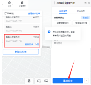 自动跳转酷家乐方案场景,进行查看对应退回的订单,点开[查看反馈],修改方案之后再点击[重新提审];