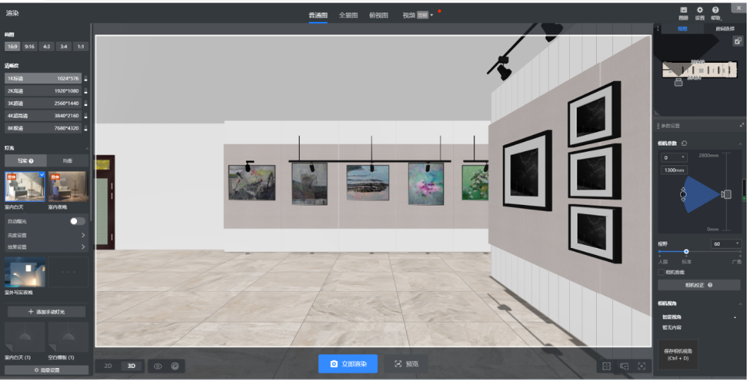 最后是酷家乐灯光渲染工具,酷家乐丰富的灯光模板可以帮助新手同学完成合格的作品,而渲染过程中,除实时渲图外,还可以制作全屋3D漫游图,让观看者身临其境,提升虚拟展厅的用户游览体验。