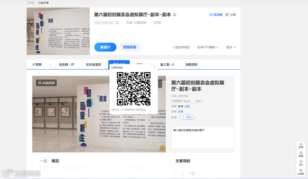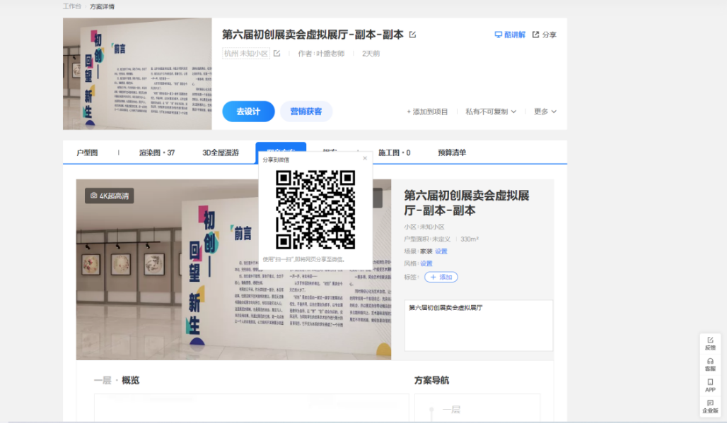 最后,学生完成虚拟展览策划文本,结合酷家乐平台导出的丰富图片及影像素材,如方案户型图、装修效果图、全屋3D漫游以及移动端可观看的二维码,在课堂现场以PPT等形式展示汇报,让教师及其他同学感受虚拟策展作业成果。