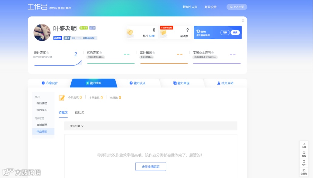 教师可在任意时间通过酷家乐平台登录教育版老师账号,对已提交作业进行打分和指导,且已批改的作业将会永久留存。