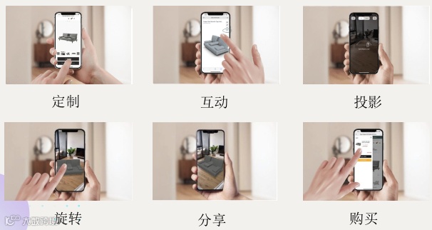 酷品秀还能够将商品模型通过 AR 技术置于真实环境中,体验实景搭配的效果。