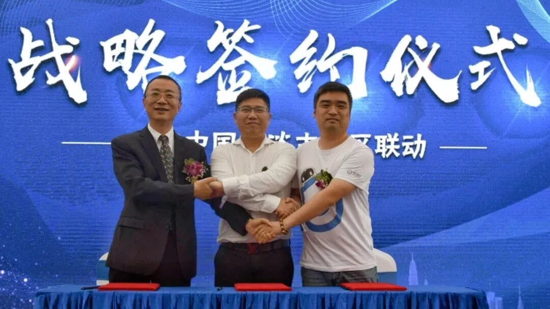 从左至右:中国陶瓷城营运总经理高原/中国建材市场协会卫浴分会秘书长、佛山市卫浴洁具行业协会秘书长刘文贵/酷家乐硬装事业部总经理之余签订战略合作协议