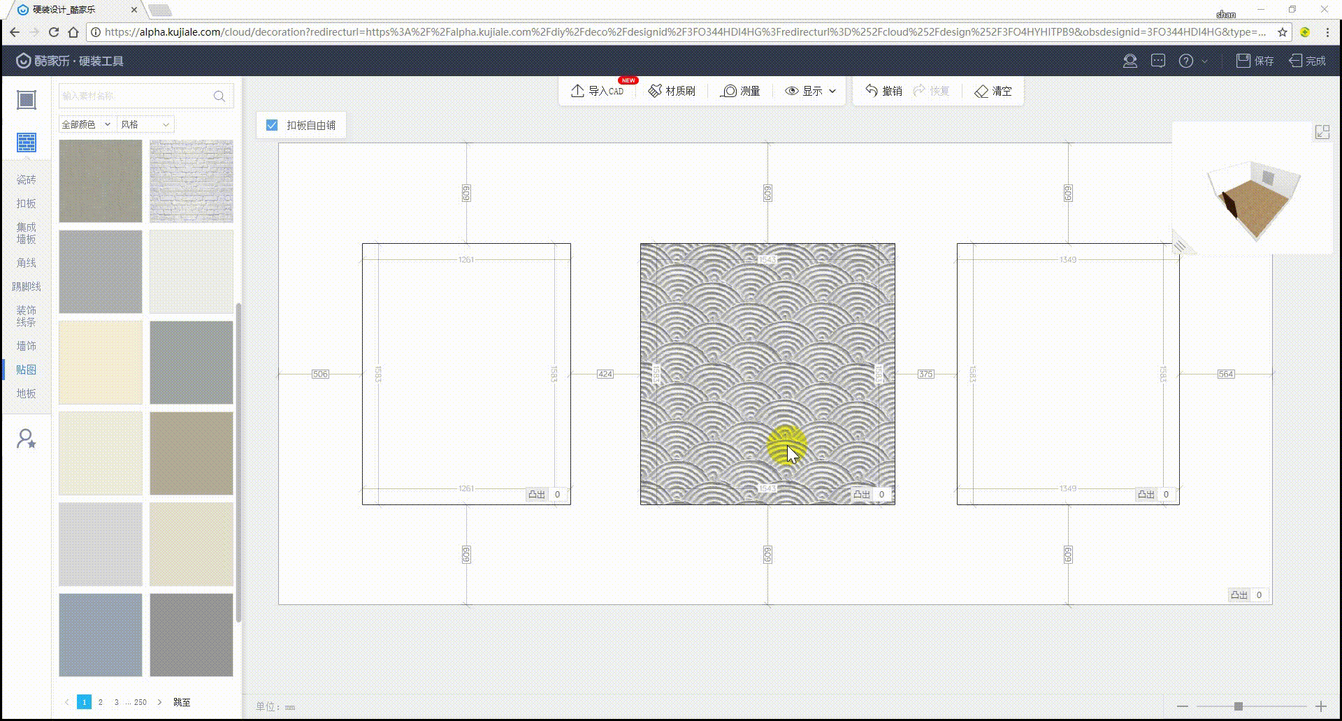 再进入到墙面工具,在贴图分类中找到要应用的素材底纹图,在墙面区域进行铺贴: