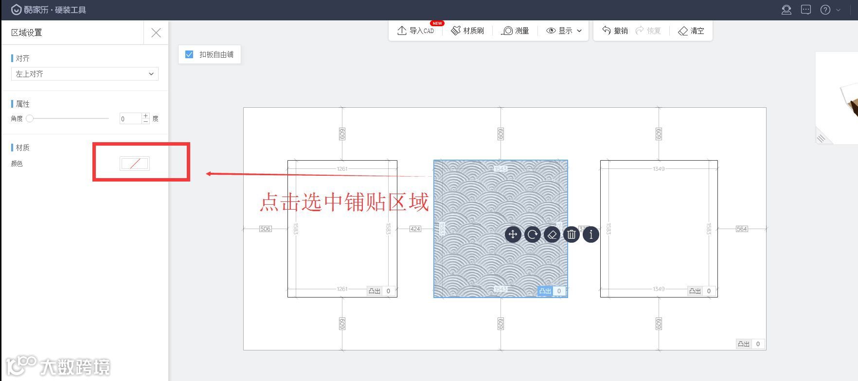 铺贴好后,点击选中铺贴区域,可以看到左侧属性栏有个材质分类,颜色选项: