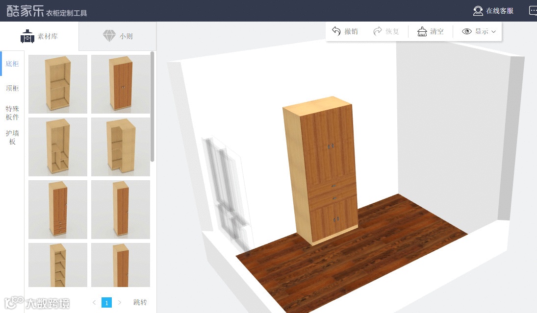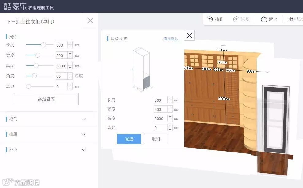 衣柜属性可以做到自由扩展,商家在模型里定义了多少属性,就可以支持多少替换,例如可添加滑轨,五金配件等。
