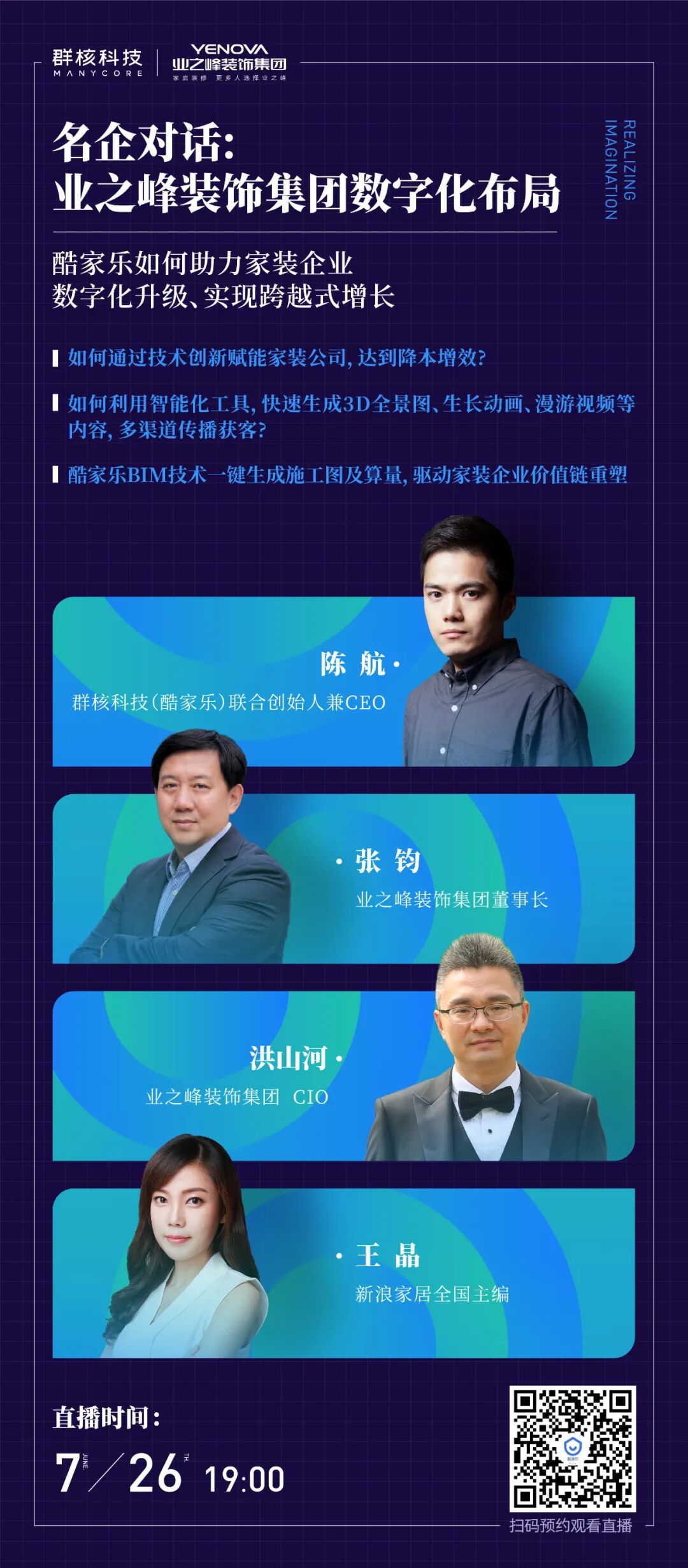 7月26日晚19:00,一场围绕“家装企业数字化升级,如何实现跨越式增长”的企业对话将展开。业之峰如何通过技术创新赋能公司,达到降本增效?又是如何借助酷家乐BIM技术,一键生成施工图和算量,驱动实现价值链重塑?业之峰遇到酷家乐后的数字化故事全面揭露。