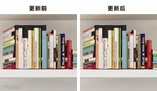 -书架上的书,同一分辨率,右图书本上的文字更加清晰!