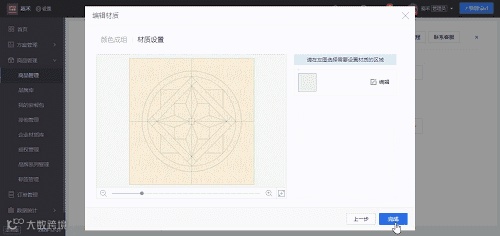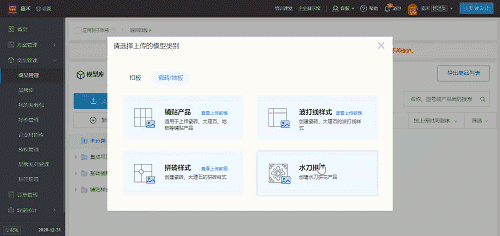 step1 进入商家后台后,依次点击“商品管理→商品管理→铺贴产品→上传素材→瓷砖/地板”,有没有发现右下角多了“水刀拼花”,点击“水刀拼花”即可进入上传页面!