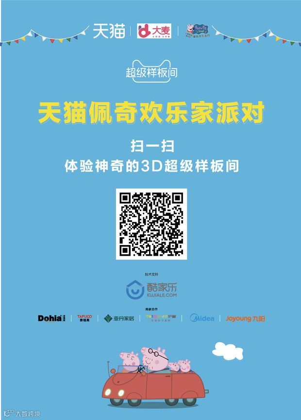 而9月17日至22日,天猫“家装生活节”正式上线,小猪佩奇超级样板间也将在线上展示,通过手机淘宝或支付宝APP扫码“佩奇欢乐家派对”活动现场的二维码即可进入。