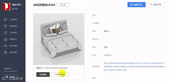 在商品管理后台,对于数千款面料的家具,只需上传一个模型+千款材质面料贴图,即可搞定,不用再耗费资金重复建模,大幅提高效率,产品管理更方便,上传模型的人力成本也将大大减少。