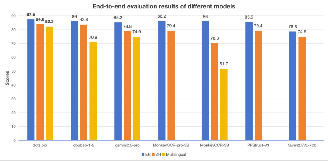 性能强:在基准测试中,dots.ocr 在文本、表格和阅读顺序方面实现了最佳的性能,同时其公式识别结果可与豆包 1.5、Gemini 2.5 Pro 等大得多的模型相媲美。