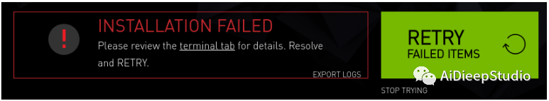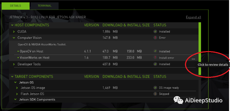 找到失败的组件后,单击“ 安装错误”图标右侧的省略号(...),将其重定向到“ 终端”选项卡,该选项卡将显示确切的错误。