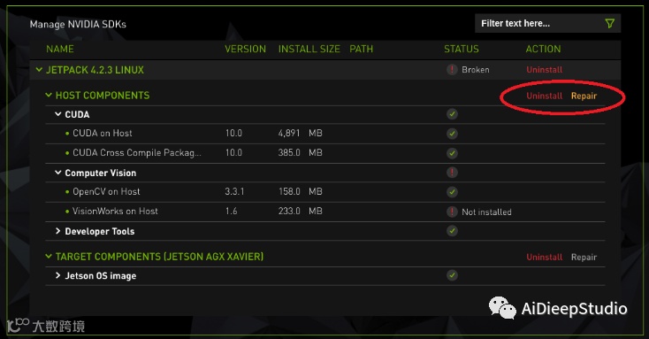 在STEP 01中,使用“修复/卸载”按钮进入“ 管理NVIDIA SDK”页面。如果需要,请展开状态为“已损坏”的SDK,然后单击相关部分(主机或目标)的“ 修复 ” 。