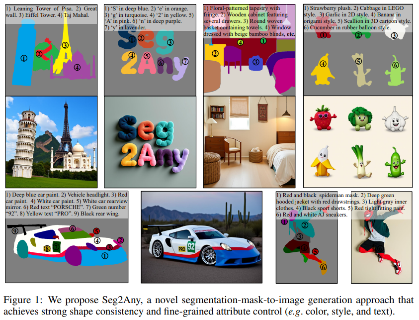复旦大学、海信研究院联合提出的 Seg2Any 是一种新颖的分割掩模到图像生成方法,可实现强大的形状一致性和细粒度的属性控制(例如颜色、样式和文本)。