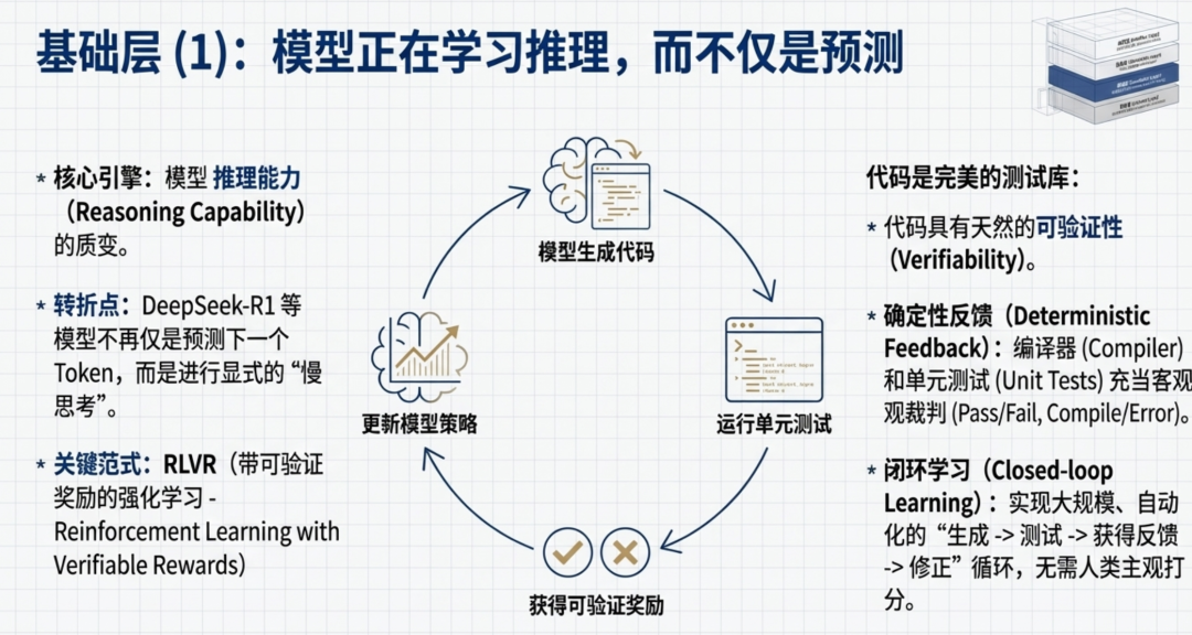代码要么编译通过,要么报错;测试用例要么 Pass,要么 Fail。这种二元信号(Binary Signal)比人类打分更精准。 - 闭环学习: