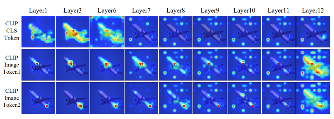 这个思路也是我们去排查模型问题的常见手段:从网络各层的注意力图去排查分析!CLIP 使用 [CLS] token 来表征整幅图像的总体特征,并据此执行图像-文本对比学习,接下来我们看看CLIP的各层发生了什么。