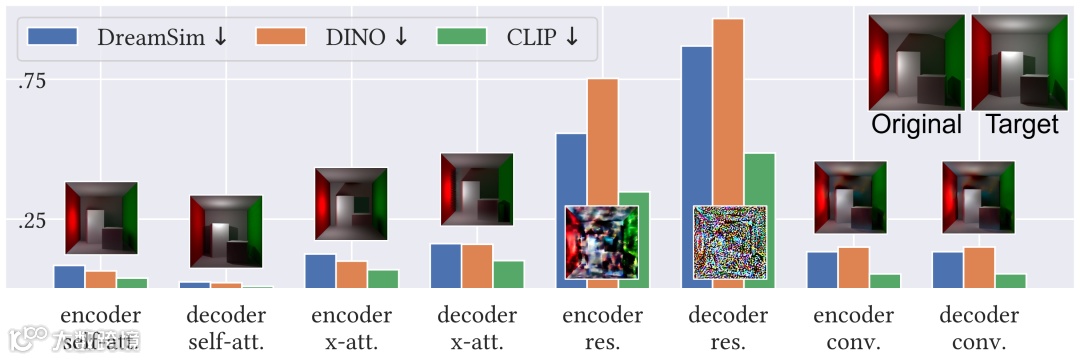 为了研究哪些层编码了光传输现象,论文进行了一项特征注入实验:将来自 relit 图像生成的激活信号注入到原始图像(来自同一场景)的生成过程中。我们发现光传输效应主要编码在自注意力层中,尤其是在基于 UNet 的扩散模型(例如 SD 1.5)的解码器中。这并不奇怪——我们推测自注意力中的多对多交互类似于光传输交互,这使得这些层成为编码此类效应的自然场所。从这个意义上讲,自注意力可以作为光传输建模的归纳偏差。