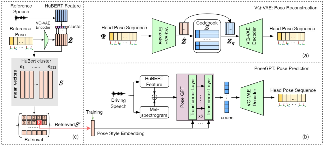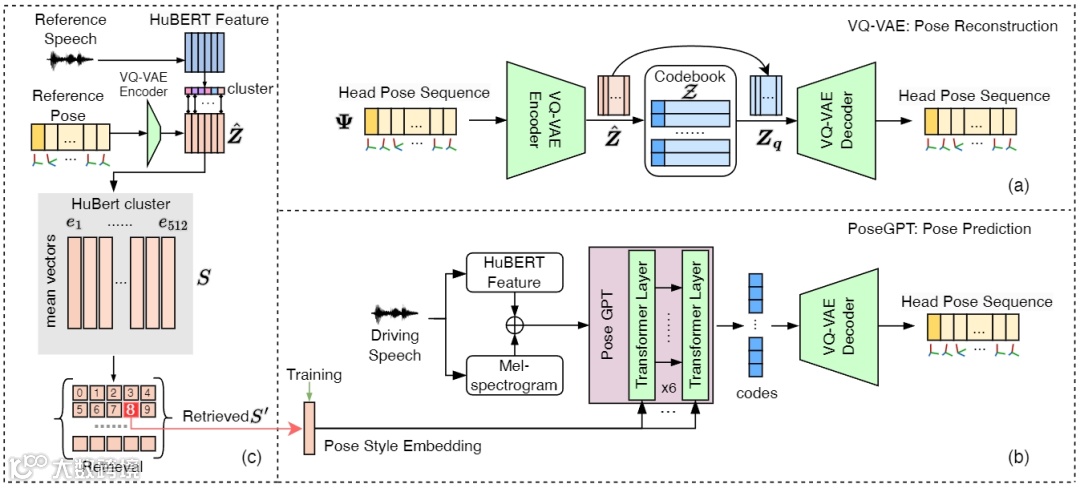 姿势个性化:构建 离散姿势先验库,结合语义感知姿势风格矩阵,无需微调即可检索并迁移参考视频中的头部姿势特征; -