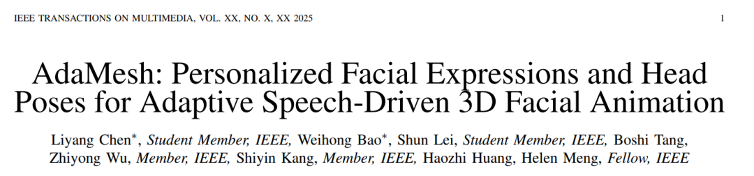 在虚拟角色与数字人技术中,如何生成兼具真实感与个性化的语音驱动面部动画仍是关键挑战。现有方法往往依赖海量数据或通用模型,难以捕捉用户独特的说话风格(如微表情、头部动态)。为此,由清华大学深圳国际研究生院、商汤科技、香港中文大学等提出的 AdaMesh,一种仅需 10秒参考视频 即可自适应学习个性化说话风格的框架。