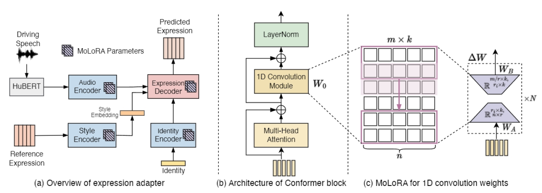 表情个性化:引入 混合低秩自适应(MoLoRA) 模块,通过微调表情适配器高效捕捉面部表情风格,避免传统微调对大量数据的依赖; -