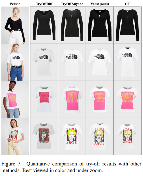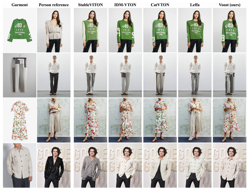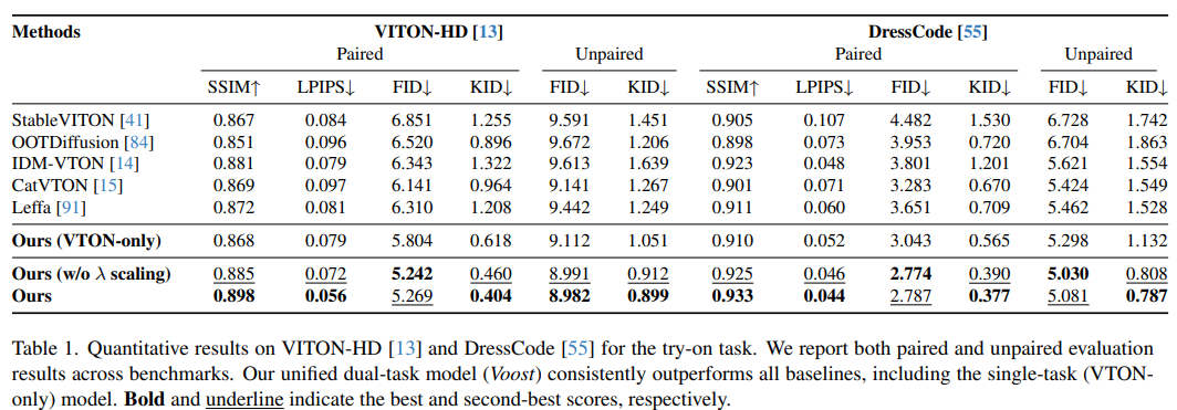 虚拟试穿旨在合成人身穿着目标服装的真实图像,但准确建模服装与人体的对应关系仍然是一项持续挑战,尤其是在姿势和外观变化的情况下。论文提出了一个统一且可扩展的框架Voost,它使用单个扩散变换器联合学习虚拟试穿和试脱。通过联合建模这两个任务,Voost使每对服装-人对能够同时监督两个方向,并支持灵活地调节生成方向和服装类别——从而增强服装-人体关系推理,无需特定于任务的网络、辅助损失或额外标签。此外论文引入了两种推理时间技术:用于增强对分辨率或掩模变化的鲁棒性的注意力温度缩放,以及利用任务间双向一致性的自校正采样。大量实验表明,Voost在试穿和试脱基准测试中均取得了最佳结果,在对齐精度、视觉保真度和泛化能力方面始终优于强大的基准。