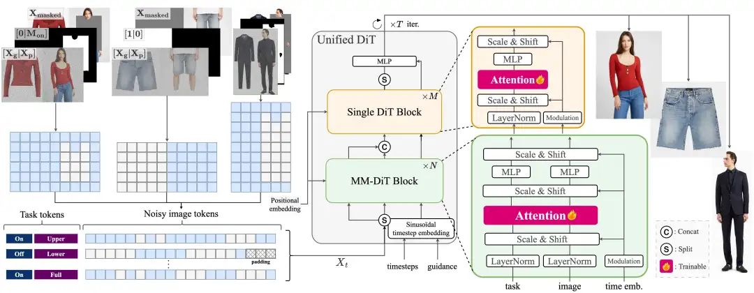 Voost流程概览。 Voost 通过统一的扩散变换器实现双向虚拟试穿和试脱,从而实现可扩展学习。