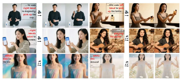 近年来,音频驱动的人像视频生成广泛应用于虚拟助手、数字人、影视制作等领域。然而,大多数方法仅关注面部表情(如嘴型驱动),忽略了自然的身体动作与场景交互,限制了在动态交互场景中的应用。此外,当前模型在音频与文本提示融合控制方面精度不足,缺乏灵活性。