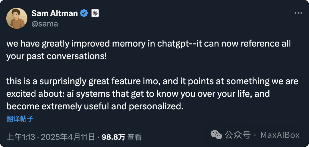 11 日凌晨一点多,他发帖公布了“答案”:ChatGPT 解锁记忆功能,可以参考过往所有对话。