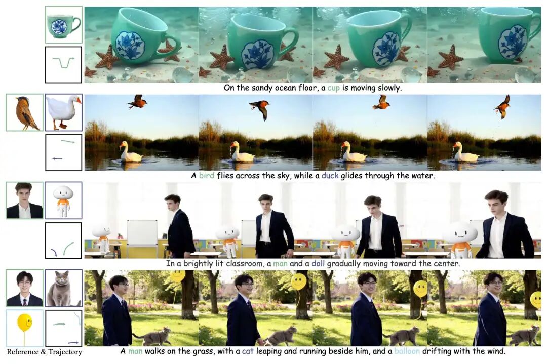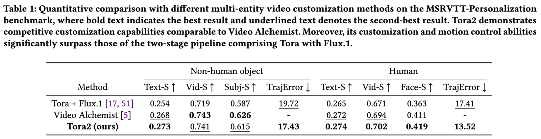 性能竞争力:在MSRVTT-Personalization基准测试中超越现有方法(如Video Alchemist、Tora),同时支持更复杂的运动控制。 -