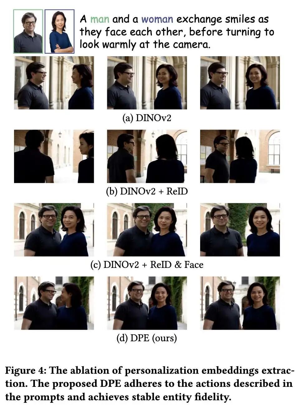 为评估解耦个性化编码器的有效性,本文对比了四种嵌入提取方法:(a) 使用DINOv2图像编码器的低频全局特征(如Video Alchemist);(b) 通过线性投影合并全局特征与ReID模型的高频特征;(c) 通过线性投影合并全局特征与ReID/人脸识别模型的解耦高频特征;(d) 采用本文DPE,通过Q-Former架构查询拼接嵌入。下图4和表2展示了定性与定量结果。