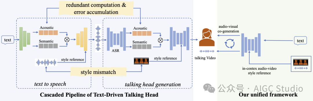 近年来,头部特写生成 (THG) 技术取得了显著进展,这得益于其有望彻底改变人机交互方式,从文本界面向逼真的视频聊天转变。然而,文本驱动的头部特写研究仍未得到充分探索,现有方法主要采用级联流水线,将文本转语音 (TTS) 系统与音频驱动的头部特写模型相结合。这种传统流水线不仅增加了系统复杂性和延迟开销,而且从根本上存在视听输出异步以及生成的语音与视觉表情之间风格差异的问题。