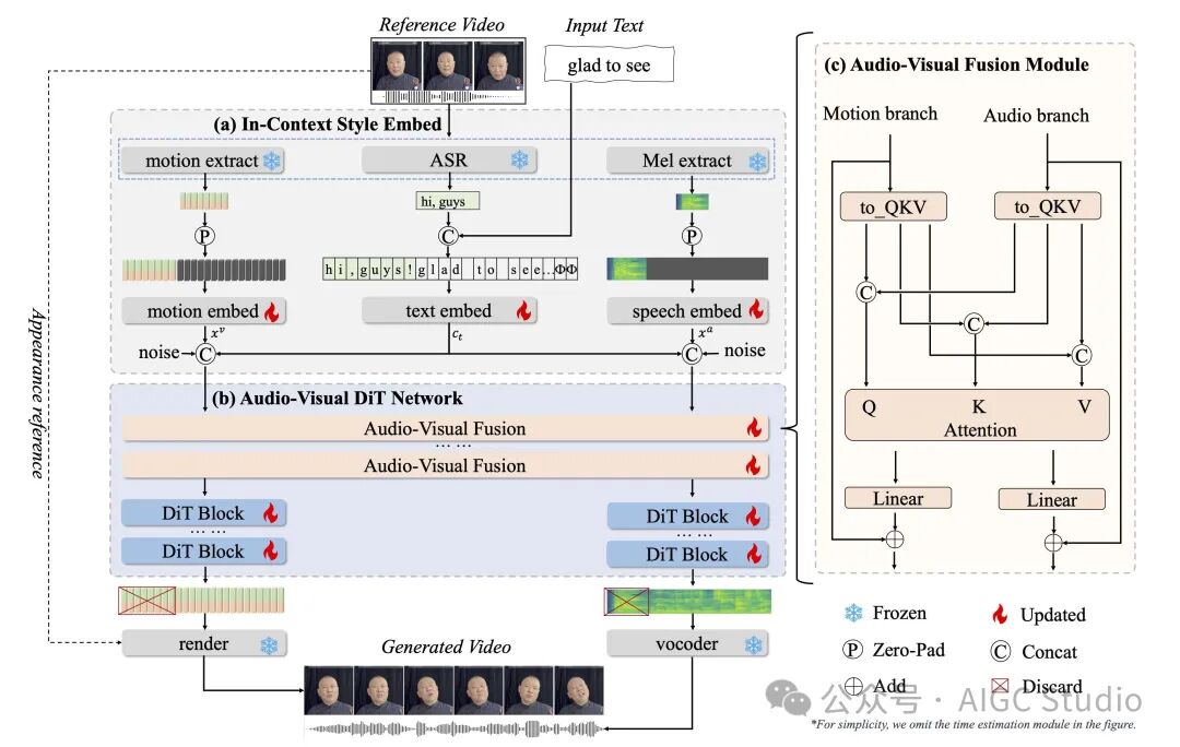 (b)音频和视觉特征在视听融合模块中共同交互。然后,音频和视觉特征分别输入到多个 DiT 块中。