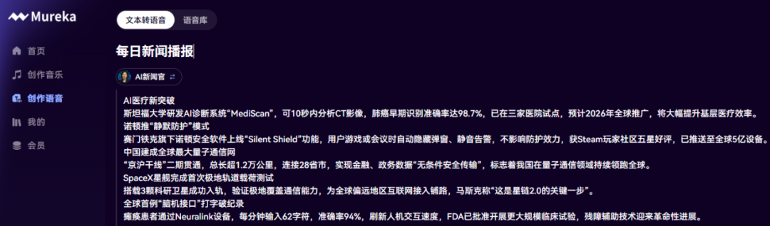 强大的TTS功能,满足你对语音创作的一切想象。比如使用AI新闻官播报每日新闻。