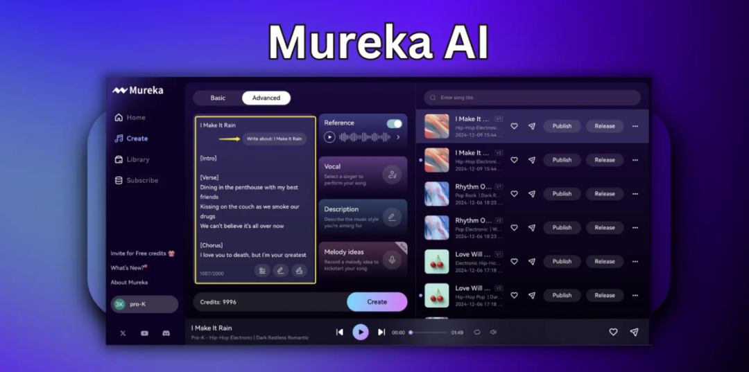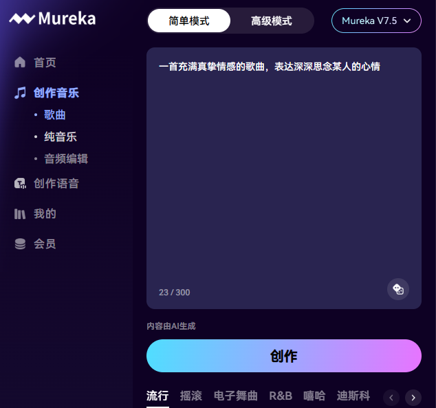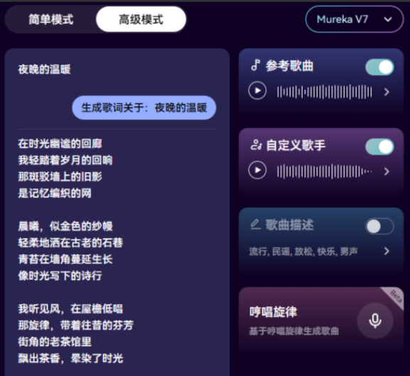 只需输入一句文字描述你想要的歌曲,无需写歌词或提供参考音乐,Mureka 就能自动生成完整歌曲;