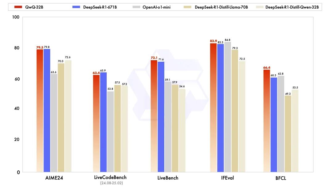 可以看到在官方放出的评测图中, QwQ-32B 与满血版 DeepSeek R1(671B)在五项基准测试的得分不相上下,更是远超同尺寸 R1 蒸馏模型。
